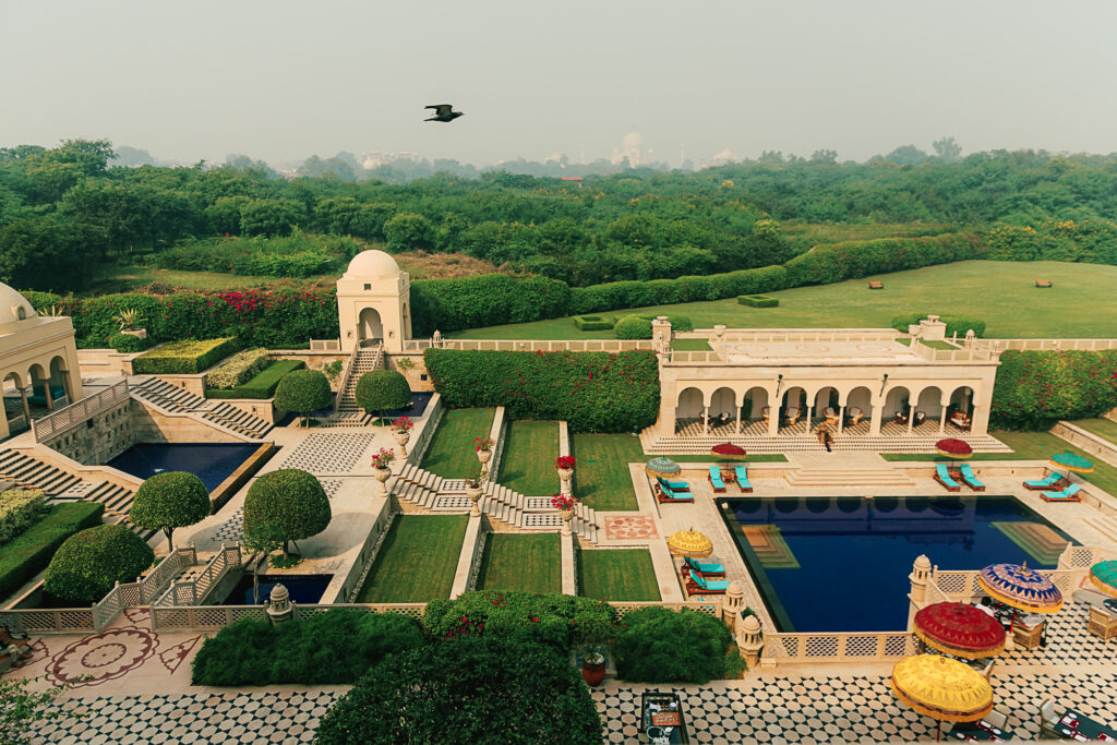 The Bellevue restaurant serves international dishes and local favorites, while Esphahan focuses on traditional Indian cuisine, rich, balanced, and beautifully executed. There’s also a bar overlooking the Taj Mahal, serving fine wines and cigars, which feels as cinematic as it sounds.